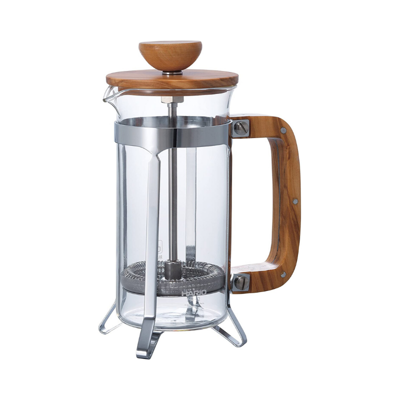 Cafe Press is an elegant French Press from Hario, a Japanese manufacturer. Cafe press stands out with its body made of glass, metal and olive wood.